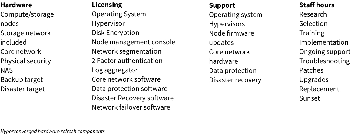Many organizations fail to account for numerous components of the hardware refresh approach: licensing, maintenance, security posture, interoperability, and the impact on staff time spent on week-in week-out maintenance as part of the overall comparison.