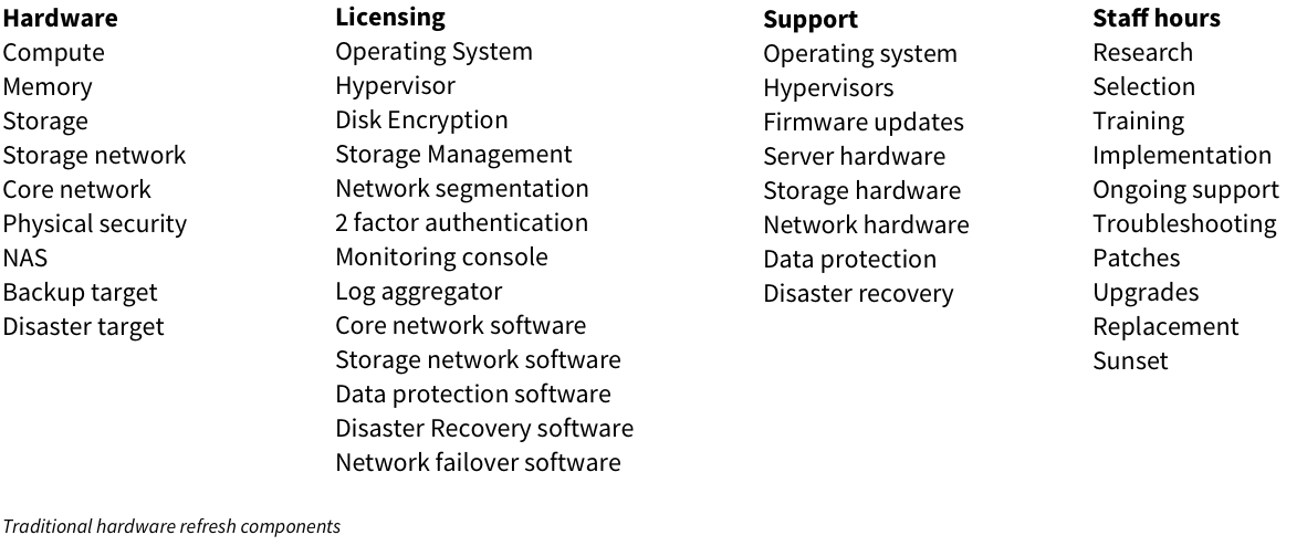 At first glance, a traditional infrastructure refresh seems relatively simple: host servers, storage systems, core network, data protection, and all the software licensing needed to run it.