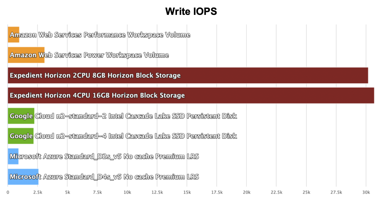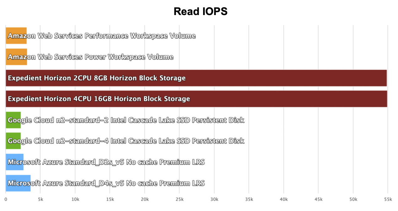 When Cloud Mercato reviewed VDI storage performance, Expedient again outperformed the competition. By allowing users to take advantage of unutilized IOPS (Input/Output per second) when available, Expedient can deliver a better and more consistent desktop experience. In fact, Expedient exhibits around 18x higher performance for comparable machine types.