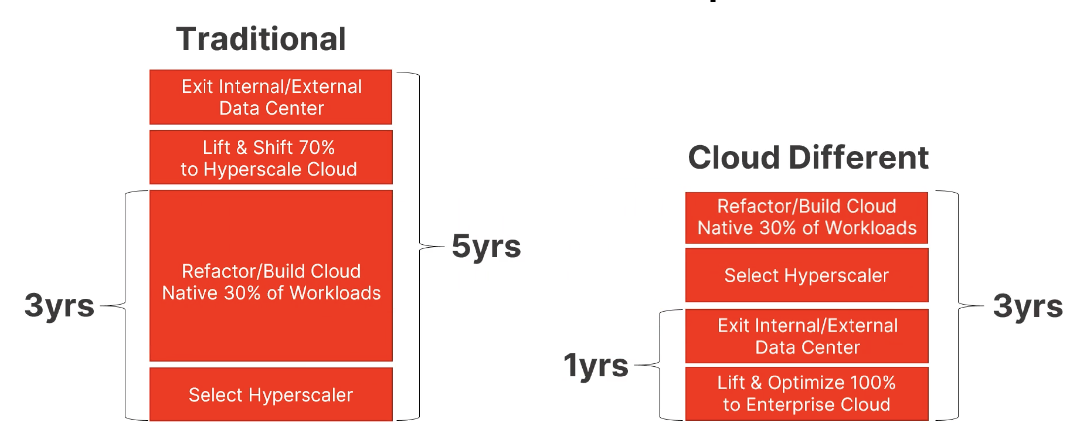 In a traditional cloud transformation model, businesses start by selecting a hyper scaler like Azure and refactoring or building cloud-native workloads. Then they lift and shift 70 percent to the hyper scaler cloud before ultimately exiting the data center. This typically takes five years, adding to technical debt and causing a lot of frustration along the way.